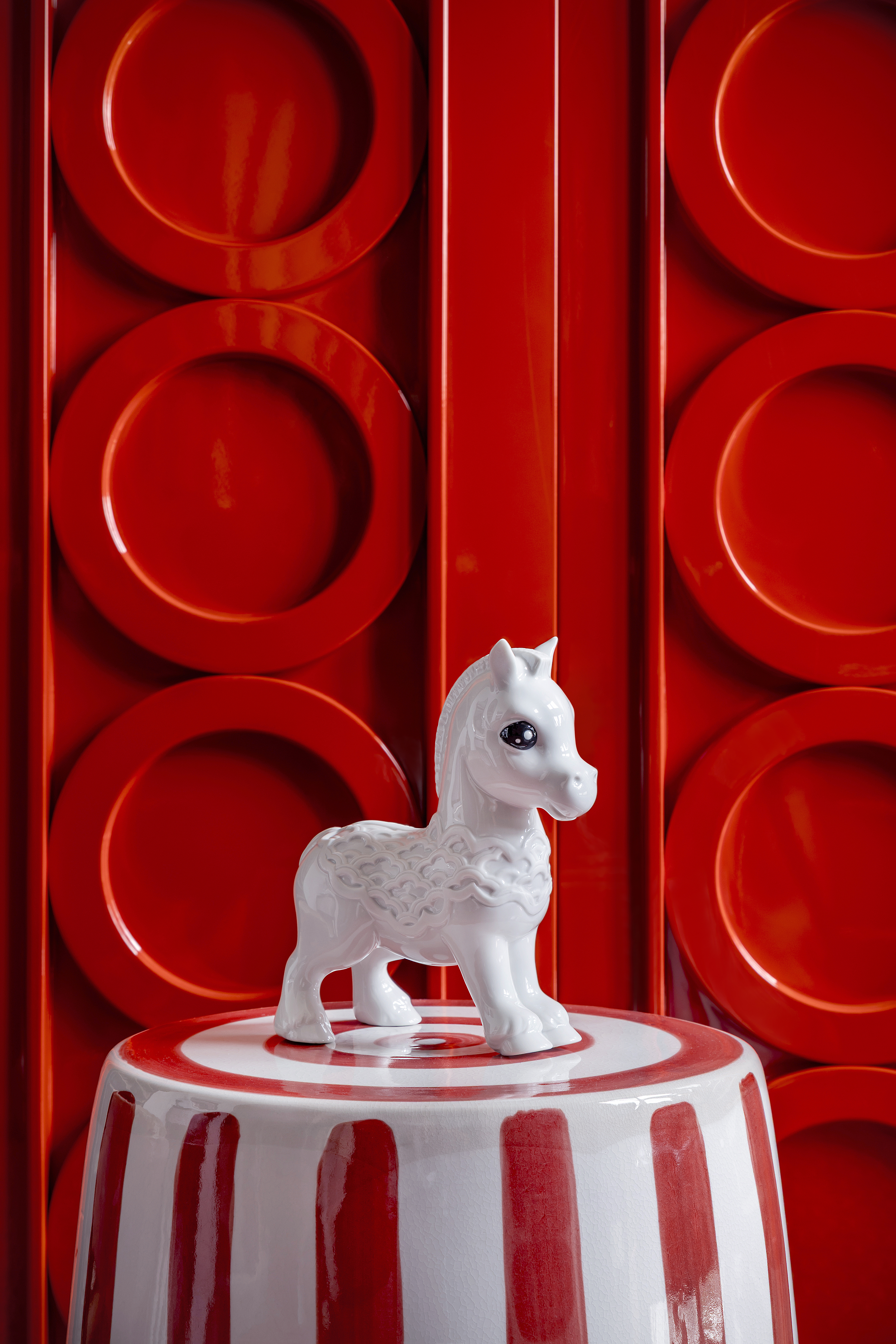 A functional reinterpretation of the horse motif appears in Horse Vase, where the animal’s silhouette is transformed into a decorative object. The stylized shape and hand-painted black glossy mane add character and a subtle playfulness, uniting utility with artistic expression while preserving the brand’s distinctive visual language.