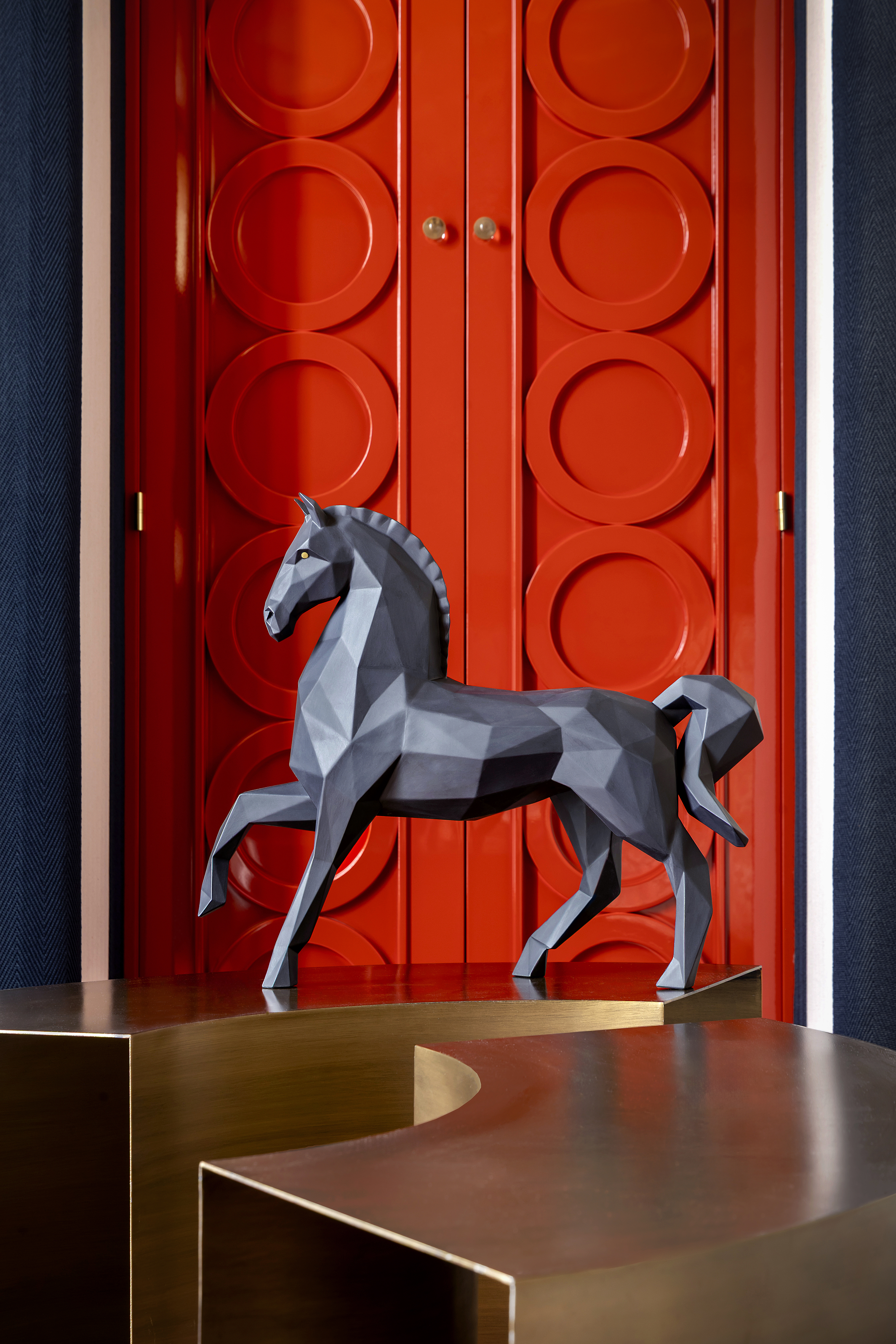 An abstract artistic language unfolds in Origami Horse. Inspired by the Japanese art of origami, this sculpture in black matte porcelain captures the animal in motion: a raised leg and carefully balanced silhouette evoke a sense of dynamism and poise. Faceted surfaces enhance the interplay of light and shadow, emphasizing the elegance and discipline of the form.
